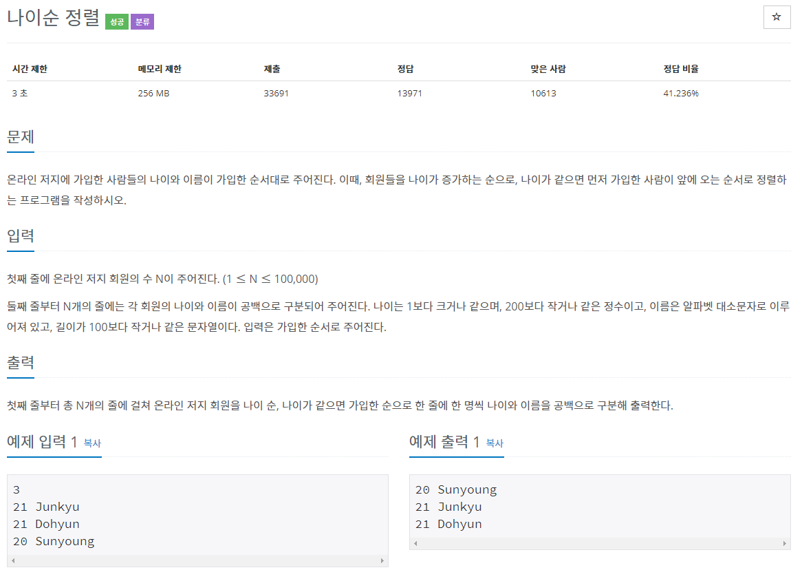 온라인 저지에 가입한 사람들의 나이와 이름이 가입한 순서대로 주어진다. 이때, 회원들을 나이가 증가하는 순으로, 나이가 같으면 먼저 가입한 사람이 앞에 오는 순서로 정렬하는 프로그램을